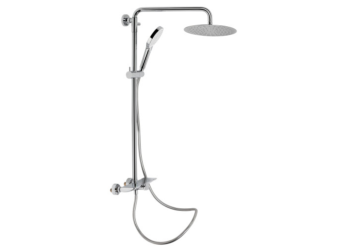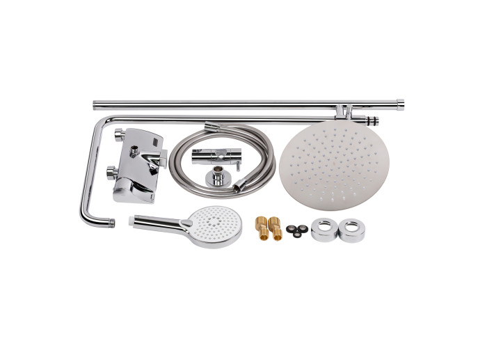 Змішувач, кронштейн для верхнього душу, лійка для верхнього душу, кронштейн для ручного душу, лійка для ручного душу, душовий шланг, душова стійка, кріпильні деталі.