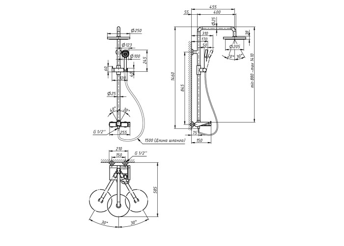 Діаметр лійки, мм Ручний душ: 123х123. Верхній душ: 250х250.