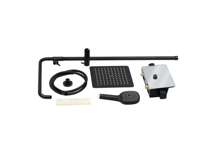 Змішувач, кронштейн для верхнього душу, лійка для верхнього душу, кронштейн для ручного душу, лійка для ручного душу, душовий шланг, душова стійка, рівень, кріпильні деталі.