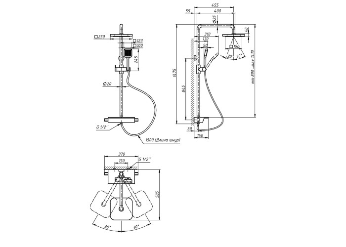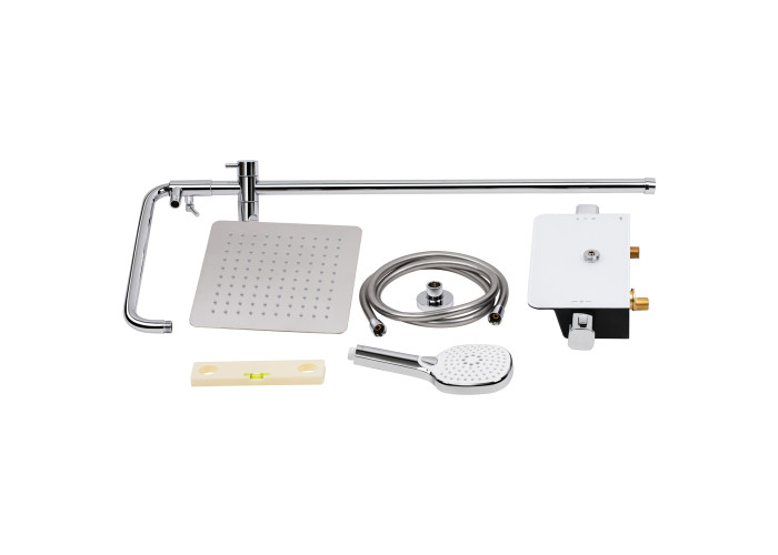 Змішувач, кронштейн для верхнього душу, лійка для верхнього душу, кронштейн для ручного душу, лійка для ручного душу, душовий шланг, душова стійка, рівень, кріпильні деталі.
