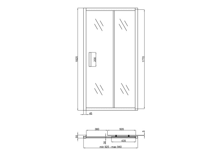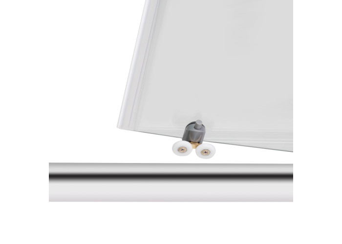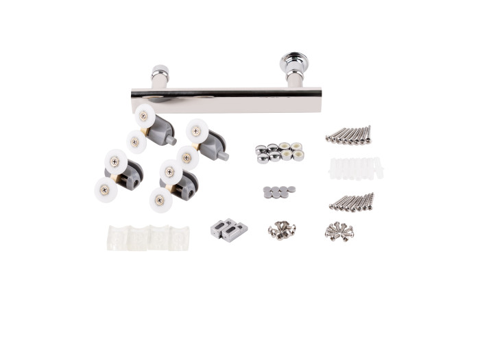 Глухе скло, скляні двері, розширювальні профілі, верхній профіль, нижній профіль, бічні профілі, ручка, подвійні ролики, комплект кріплень, набір ущільнювачів, заглушки.