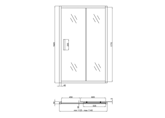 Глухе скло, скляні двері, розширювальні профілі, верхній профіль, нижній профіль, бічні профілі, ручка, подвійні ролики, комплект кріплень, набір ущільнювачів, заглушки.