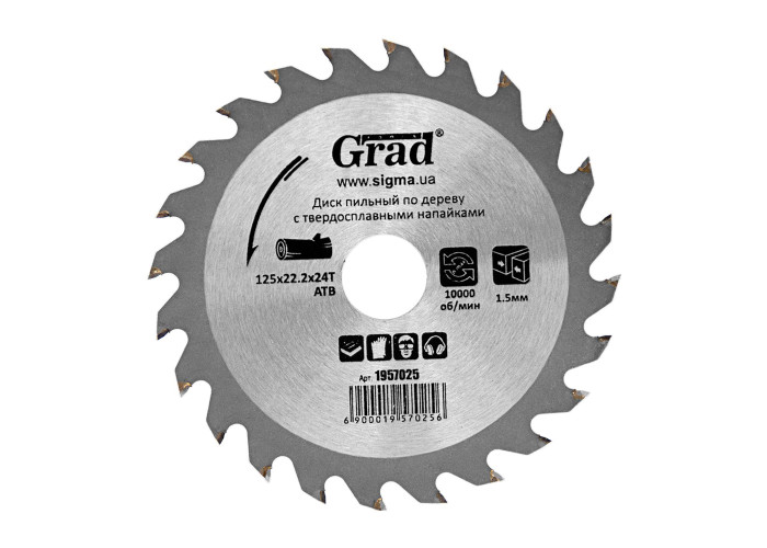 Диск пильний по дереву з твердосплавними напайками Ø125х22.2х24 Т, 10000 об/хв Grad (1957025) призначений для виконання будь-яких стандартних робіт по дереву, різання виробів з м'якої і твердої деревини, фанери, ДСП, ДВП, МДФ і комбінованих матеріалів на основі дерева. Додатковою перевагою є можливість заміни і заточування зубів. Особливості: розміри узгоджені з посадочними і зовнішніми діаметрами всіх найбільш поширених типів електроінструменту; забезпечують поздовжній і поперечний розпив; сучасна автоматизована технологія виготовлення; змінні зуби з твердого сплаву форми АТВ; оптимальна продуктивність завдяки міцно припаяним твердосплавним зубам; можливість багаторазового переточування інструменту; застосовують для побутового та професійного використання; забезпечують стабільну роботу при економічній ціні.
