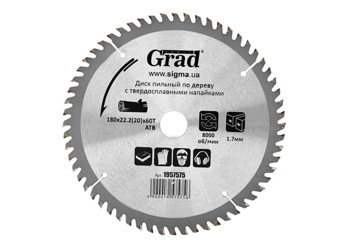 Диск пильний по дереву з твердосплавними напайками Grad Ø180х22.2(20)х60 Т, 8000 об/хв Grad (1957575) призначений для виконання будь-яких стандартних робіт по дереву, різання виробів з м'якої і твердої деревини, фанери, ДСП, ДВП, МДФ і комбінованих матеріалів на основі дерева. Додатковою перевагою є можливість заміни і заточування зубів. Особливості: розміри узгоджені з посадочними і зовнішніми діаметрами всіх найбільш поширених типів електроінструменту; забезпечують поздовжній і поперечний розпив; сучасна автоматизована технологія виготовлення; змінні зуби з твердого сплаву форми АТВ; оптимальна продуктивність завдяки міцно припаяним твердосплавним зубам; можливість багаторазового переточування інструменту; застосовують для побутового та професійного використання; забезпечують стабільну роботу при економічній ціні.