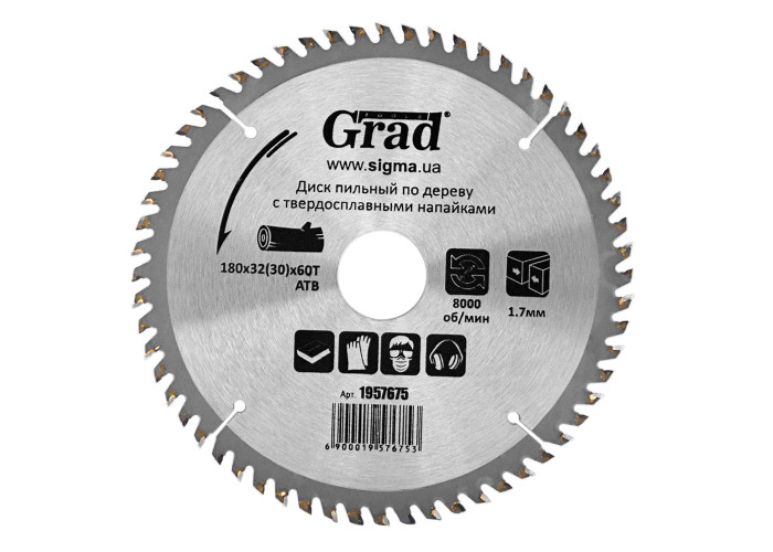 Диск пильний по дереву з твердосплавними напайками Grad Ø180х32(30)х60 Т, 8000 об/хв Grad (1957675) призначений для виконання будь-яких стандартних робіт по дереву, різання виробів з м'якої і твердої деревини, фанери, ДСП, ДВП, МДФ і комбінованих матеріалів на основі дерева. Додатковою перевагою є можливість заміни і заточування зубів. Особливості: розміри узгоджені з посадочними і зовнішніми діаметрами всіх найбільш поширених типів електроінструменту; забезпечують поздовжній і поперечний розпив; сучасна автоматизована технологія виготовлення; змінні зуби з твердого сплаву форми АТВ; оптимальна продуктивність завдяки міцно припаяним твердосплавним зубам; можливість багаторазового переточування інструменту; застосовують для побутового та професійного використання; забезпечують стабільну роботу при економічній ціні.