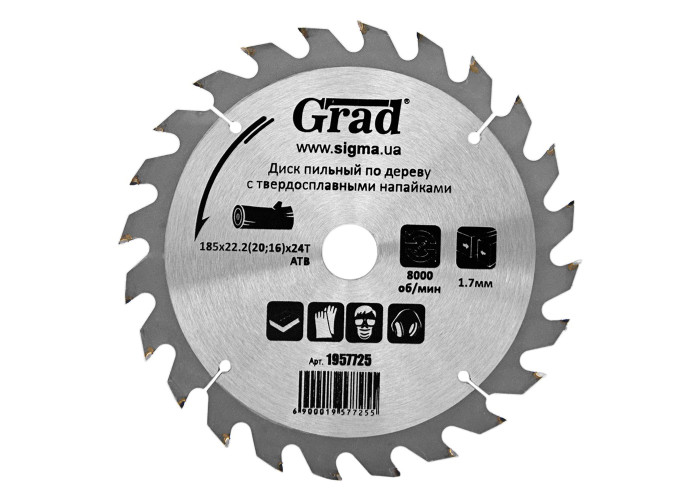 Диск пильний по дереву з твердосплавними напайками Grad Ø185х22.2(20;16)х24 Т, 8000 об/хв Grad (1957725) призначений для виконання будь-яких стандартних робіт по дереву, різання виробів з м'якої і твердої деревини, фанери, ДСП, ДВП, МДФ і комбінованих матеріалів на основі дерева. Додатковою перевагою є можливість заміни і заточування зубів. Особливості: розміри узгоджені з посадочними і зовнішніми діаметрами всіх найбільш поширених типів електроінструменту; забезпечують поздовжній і поперечний розпив; сучасна автоматизована технологія виготовлення; змінні зуби з твердого сплаву форми АТВ; оптимальна продуктивність завдяки міцно припаяним твердосплавним зубам; можливість багаторазового переточування інструменту; застосовують для побутового та професійного використання; забезпечують стабільну роботу при економічній ціні.