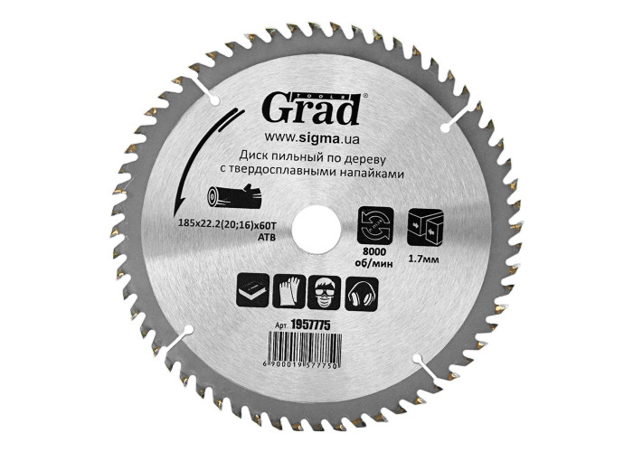 Диск пильний по дереву з твердосплавними напайками Grad Ø185х22.2(20;16)х60 Т, 8000 об/хв Grad (1957775) призначений для виконання будь-яких стандартних робіт по дереву, різання виробів з м'якої і твердої деревини, фанери, ДСП, ДВП, МДФ і комбінованих матеріалів на основі дерева. Додатковою перевагою є можливість заміни і заточування зубів. Особливості: розміри узгоджені з посадочними і зовнішніми діаметрами всіх найбільш поширених типів електроінструменту; забезпечують поздовжній і поперечний розпив; сучасна автоматизована технологія виготовлення; змінні зуби з твердого сплаву форми АТВ; оптимальна продуктивність завдяки міцно припаяним твердосплавним зубам; можливість багаторазового переточування інструменту; застосовують для побутового та професійного використання; забезпечують стабільну роботу при економічній ціні.