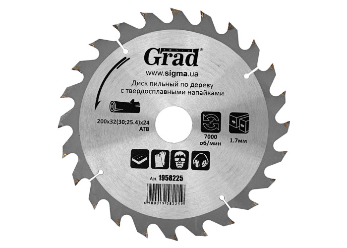 Диск пильний по дереву з твердосплавними напайками Grad Ø200х32(30;25.4)х24 Т, 7000 об/хв Grad (1958225) призначений для виконання будь-яких стандартних робіт по дереву, різання виробів з м'якої і твердої деревини, фанери, ДСП, ДВП, МДФ і комбінованих матеріалів на основі дерева. Додатковою перевагою є можливість заміни і заточування зубів. Особливості: розміри узгоджені з посадочними і зовнішніми діаметрами всіх найбільш поширених типів електроінструменту; забезпечують поздовжній і поперечний розпив; сучасна автоматизована технологія виготовлення; змінні зуби з твердого сплаву форми АТВ; оптимальна продуктивність завдяки міцно припаяним твердосплавним зубам; можливість багаторазового переточування інструменту; застосовують для побутового та професійного використання; забезпечують стабільну роботу при економічній ціні.