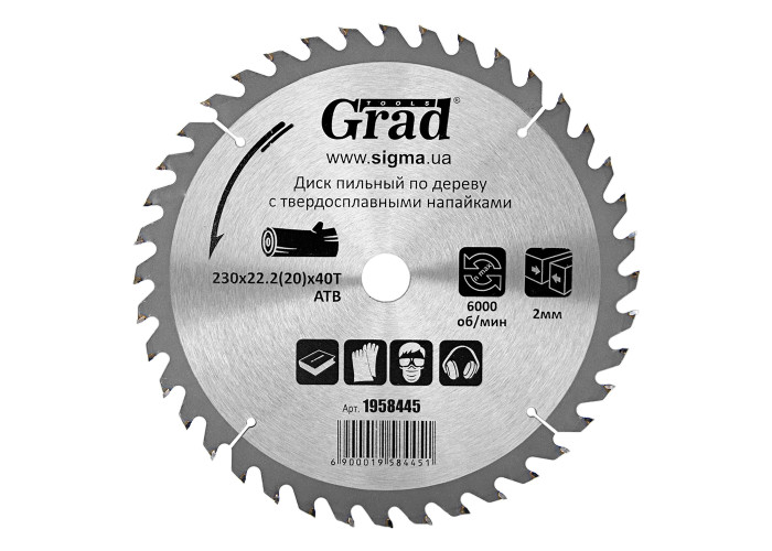 Диск пильний по дереву з твердосплавними напайками Grad Ø230х22.2(20)х40 Т, 6000 об/хв Grad (1958445) призначений для виконання будь-яких стандартних робіт по дереву, різання виробів з м'якої і твердої деревини, фанери, ДСП, ДВП, МДФ і комбінованих матеріалів на основі дерева. Додатковою перевагою є можливість заміни і заточування зубів. Особливості: розміри узгоджені з посадочними і зовнішніми діаметрами всіх найбільш поширених типів електроінструменту; забезпечують поздовжній і поперечний розпив; сучасна автоматизована технологія виготовлення; змінні зуби з твердого сплаву форми АТВ; оптимальна продуктивність завдяки міцно припаяним твердосплавним зубам; можливість багаторазового переточування інструменту; застосовують для побутового та професійного використання; забезпечують стабільну роботу при економічній ціні.