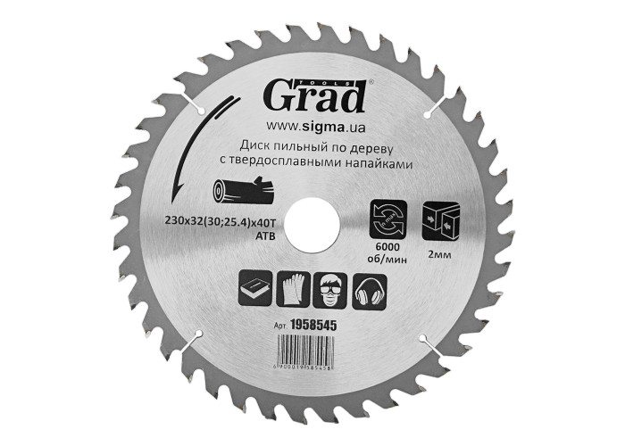 Диск пильний по дереву з твердосплавними напайками Ø230х3230;25.4х40Т, 6000об/хв Grad 1958545