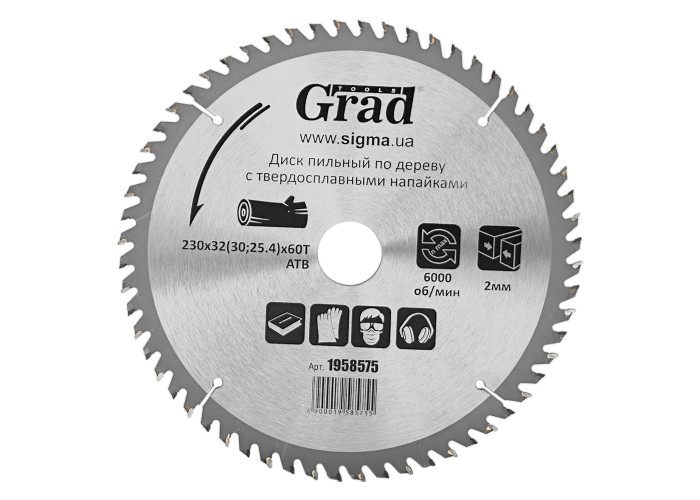 Диск пильний по дереву з твердосплавними напайками Grad Ø230х32(30;25.4)х60 Т, 6000 об/хв Grad (1958575) призначений для виконання будь-яких стандартних робіт по дереву, різання виробів з м'якої і твердої деревини, фанери, ДСП, ДВП, МДФ і комбінованих матеріалів на основі дерева. Додатковою перевагою є можливість заміни і заточування зубів. Особливості: розміри узгоджені з посадочними і зовнішніми діаметрами всіх найбільш поширених типів електроінструменту; забезпечують поздовжній і поперечний розпив; сучасна автоматизована технологія виготовлення; змінні зуби з твердого сплаву форми АТВ; оптимальна продуктивність завдяки міцно припаяним твердосплавним зубам; можливість багаторазового переточування інструменту; застосовують для побутового та професійного використання; забезпечують стабільну роботу при економічній ціні.