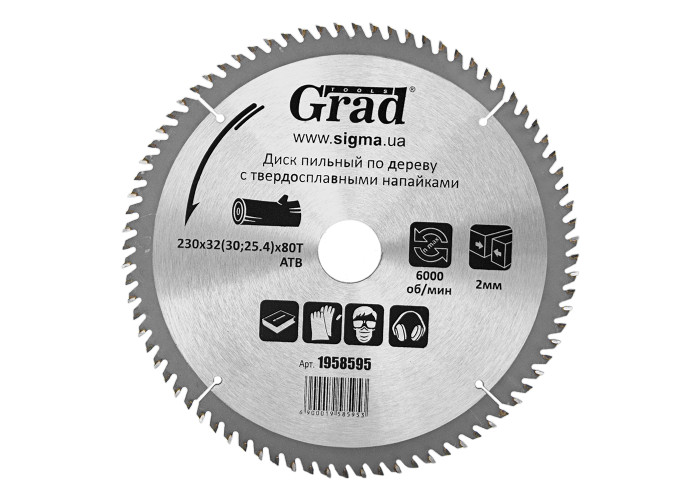 Диск пильний по дереву з твердосплавними напайками Grad Ø230х32(30;25.4)х80 Т, 6000 об/хв Grad (1958595) призначений для виконання будь-яких стандартних робіт по дереву, різання виробів з м'якої і твердої деревини, фанери, ДСП, ДВП, МДФ і комбінованих матеріалів на основі дерева. Додатковою перевагою є можливість заміни і заточування зубів. Особливості: розміри узгоджені з посадочними і зовнішніми діаметрами всіх найбільш поширених типів електроінструменту; забезпечують поздовжній і поперечний розпив; сучасна автоматизована технологія виготовлення; змінні зуби з твердого сплаву форми АТВ; оптимальна продуктивність завдяки міцно припаяним твердосплавним зубам; можливість багаторазового переточування інструменту; застосовують для побутового та професійного використання; забезпечують стабільну роботу при економічній ціні.