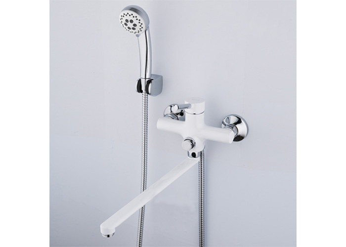 Змішувач FRAP F2244-8 для ванни з довгим прямим поворотним гусаком. Матеріал корпусу – латунь, покриття - біла емаль з хромованими елементами. Кріплення моделі – настінне, діаметр картриджа - 35 мм. В комплект поставки входить змішувач, душова лійка, шланг для душу, тримач для лійки, кріплення. Італійські технології лиття роблять внутрішню і зовнішню поверхню змішувача Frap ідеально гладенькою і покращують його антикорозійні властивості. Країна-виробник - Китай.