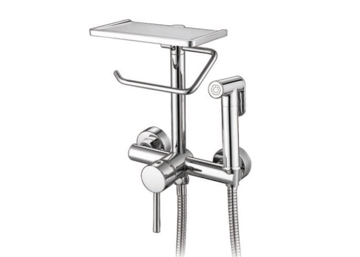 Гігієнічний душ FRAP F7515 з настінним кріпленням для зручного користування ванною кімнатою. Особливість моделі – поличка, на яку можна поставити мильницю, засоби особистої гігієни тощо, а також тримач для туалетного паперу. Модель виконана з латуні, має хромоване покриття, яке робить змішувач стійкішим до пошкоджень і сприяє кращому вигляду. Діаметр картриджа - Ø35. Управління душем здійснюється за допомогою змішувача і додаткової кнопки-важеля, яка встановлена на душовому виливі так, щоб її було зручно включати, просто тримаючи шланг у руці. За допомогою цього механізму легко контролювати потік води, його температуру і напір. Країна-виробник - Китай.