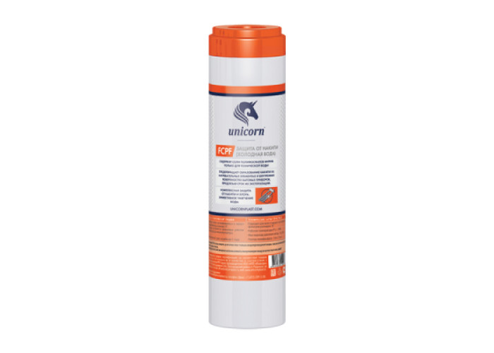 Картридж з кристалами поліфосфату FCPF 10" Unicorn містить солі поліфосфатів натрію. Запобігає утворенню накипу на нагрівальних елементах і внутрішніх поверхнях побутових приладів, продовжуючи термін їхньої експлуатації. Комплексний захист від накипу і хлору, ефективне пом'якшення води. Низька витрата поліфосфатного наповнювача забезпечує тривалий термін служби картриджа.