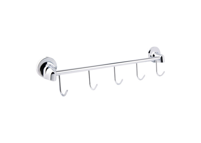 Тримач для рушників і халатів Cosh (CRM) S-80-910B5 виконаний у вигляді стрижня з п‘ятьма фіксованими гачками. Він кріпиться на стіні на зручній висоті за допомогою монтажних елементів, які входять до комплекту. Поверхня хромована, тому менш схильна до корозії і бруду.