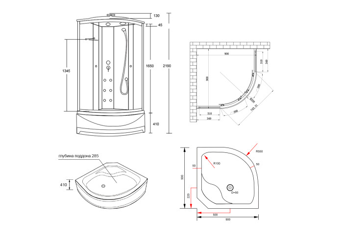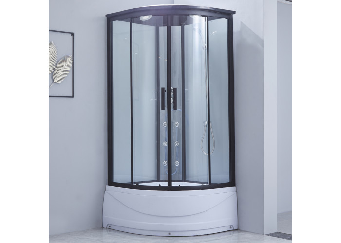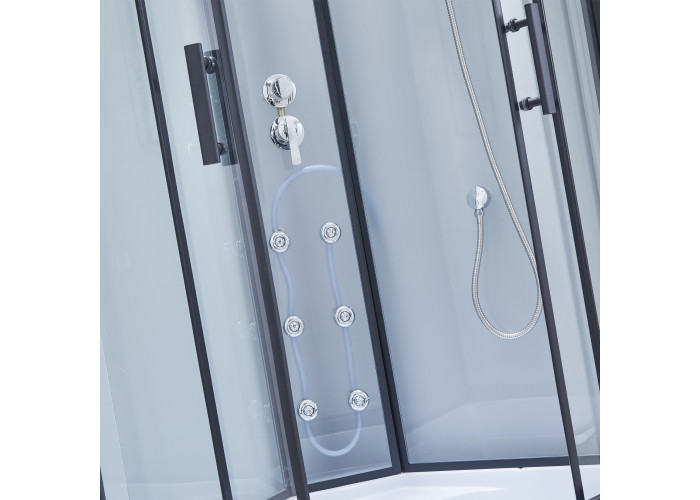 Піддон, сифон, двері, ручки, подвійні ролики, профіль, кріплення, задня стінка, глухе скло, скляні двері, панель, змішувач, лійка для ручного душа, лійка для верхнього душа, душовий шланг, кронштейн, ніжки, гідромасажні форсунки, верхня кришка, витяжка, перехідник 32/50 мм.