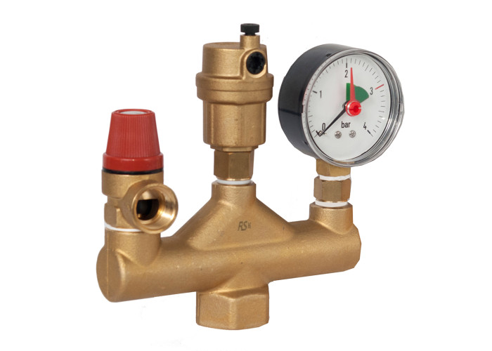 У комплект входять: автоматичний спускник повітря, запобіжний клапан, манометр. Такий прилад встановлюється на підлогових котлах для контролю за тиском в системі і для спускання зайвого повітря. Відведення повітря прилад виконує в автоматичному режимі. Запобіжний клапан зливає воду, якщо тиск перевищує 3 Бар.