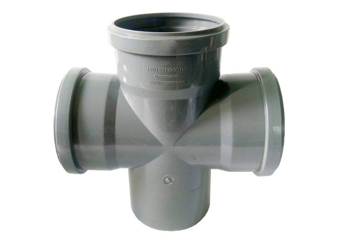 Хрестовина діаметр 110/110/110 мм, кут 90 градусів для внутрішньої каналізації. СВК - це торгова марка каналізаційних труб і фітингів класу економ. Продукція призначена для обладнання систем водовідведення з максимальною температурою стічної рідини 60 град. і короткочасної (до 1 хв.) 95 градусів, а також для вентиляції і для внутрішніх зливових стоків. Також продукція оснащена ущільнювачів гумками. ПВХ продукція виробляється з непластифікованого полівінілхлориду як монолітна (одношарова), так і тришарова. Вона не псується корозією, стійка до дії кислот, лугів і солей. Монтувати конструкцію на місці досить просто, а з'єднання виходить герметичним. При демонтажі або заміні усувається деталь також швидко. Відмінні техніко-економічні характеристики показали ПВХ каналізаційні труби і фітинги з діаметрами 110-200 мм, що зробило їх дуже популярним в приватному будівництві (дачі, невеликі будови). Характеристики: виготовлені з поліпропілену, призначені для монтажу каналізації, а саме для внутрішніх каналізаційних мереж. Виробник: "СВК", Україна.