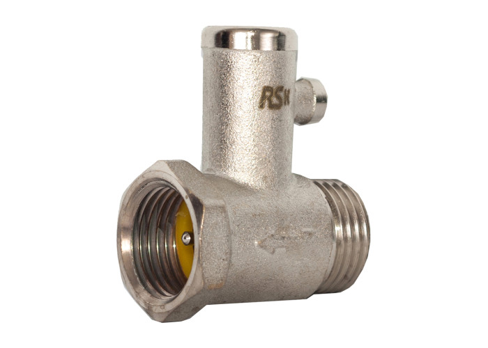 Клапан для бойлера від бренду RSk Італія. Матеріал: латунь. Конструктивно клапан являє собою корпус з латуні, в якому вбудовані 2 пружини з тарілчастими запірними елементами. Перша встановлена всередині проточного каналу і виконує функцію зворотного клапана, не пускаючи воду з бойлера назад у вхідний трубопровід. Друга пружина підвищеної жорсткості знаходиться на відводі, її завдання - скидати воду в разі перевищення певного тиску. По суті, клапан поєднує в собі 2 пристрої і є обов'язковим атрибутом кожного накопичувального нагрівача. Його основні функції: не допускати перевищення тиску в баку бойлера шляхом скидання зайвої води, захищаючи його від руйнування; захист водонагрівача від високого тиску, що може виникнути на вході з водопровідної мережі; запобігання гідроударам, що трапляються в централізованих мережах водопостачання; не дозволяти воді йти з ємності, коли тиск в мережі знижується або пропадає зовсім.