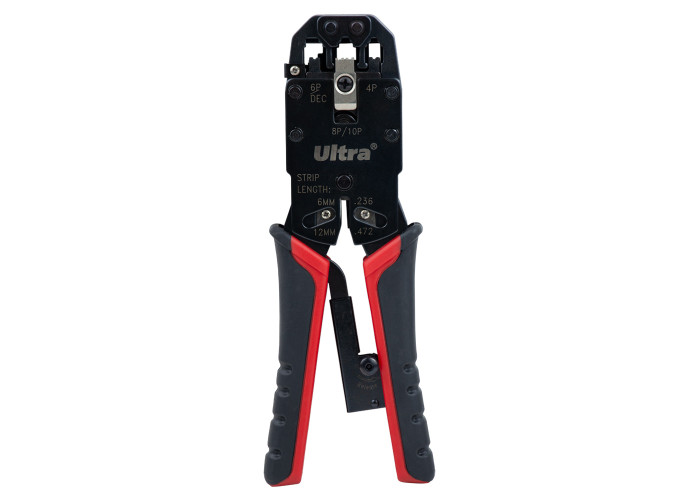 Кліщі для обтиску конекторів 4Р4С, 6Р6С, 8Р8С, 10Р10С з тріскачкою ULTRA (4372002) - професійний комбінований інструмент для обтиску одножильних і багатожильних кручених проводів. Має вбудовані кусачки на тильній частині і знімач ізоляції на лицьовій. Тріскачний механізм забезпечує надійне кріплення робочої частини і якісну роботу протягом тривалого часу. Особливості: пристосування для обтиску, зачистки і різання дроту без зміни насадок; тріскачний механиз забезпечує надійну та якісну роботу; вбудований знімач ізоляції для круглого кабелю дозволяє зняти ізоляцію за одну операцію; довговічний і компактний інструмент. Купити кліщі для обтиску ULTRA Ви можете, оформивши замовлення в нашому інтернет-магазині за допомогою простої форми, доставка здійснюється по всій Україні. Якщо у Вас виникли питання, Ви можете зателефонувати за вказаними номерами телефонів або замовити зворотний дзвінок. Фахівці нашого інтернет-магазину нададуть Вам докладні консультації та допоможуть зробити правильний вибір.
