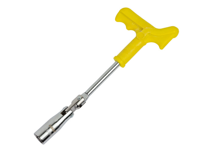 Т-подібна посилена пластикова рукоять запобігає прослизання і дозволяє міцно утримувати ключ в руці. Ключі виготовлені з міцної сталі, що володіє високими експлуатаційними характеристиками. Ключ складається з довгого металевого стержня, з одного боку якого розташована рукоять, а з іншого - головка з шарніром. Рухоме шарнірне з'єднання робить інструмент більш маневреним, а роботу в обмеженому просторі - більш зручною. Крім того, за рахунок шарніра можна підібрати оптимальний кут, щоб без пошкоджень зняти або встановити свічку. Головка ключа має шестигранний профіль, який ефективно передає зусилля на профіль свічки.