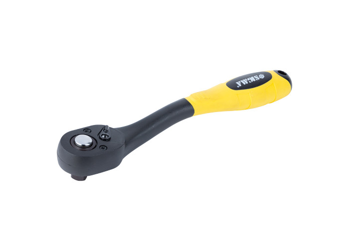 Ключ-тріскачка з вигнутою ручкою 3/8" 200мм 72T CrV 6050121 призначений для монтажу і демонтажу різьбових з'єднань. Застосовується для слюсарних робіт, а також як інструмент на автосервісі при ремонті вузлів автомобілів. Конструкція ключа-тріскачки досить проста:: вигнута рукоятка і головка, в якій розміщений храповий механізм. Додатковий вигин рукоятки дозволяє працювати у важкодоступних місцях. Ключ-тріскачка має невеликий крутний момент, працює плавно і м'яко, що забезпечує комфорт під час роботи. Конструкція передбачає кнопку швидкого скидання для швидкої зміни торцевих головок. 72-зубцейвий механізм, що забезпечує високий крутний момент.