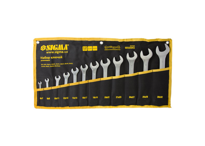 Ключі ріжкові 12шт 6-32мм CrV satine (тк чохол) Sigma (6010341) - ріжковий ключ є необхідним інструментом при складанні і розбиранні болтових з'єднань, що мають шестигранний профіль. Призначений для монтажу різьбових монтажу різьбових з'єднань і обслуговування кріплення, який відповідає розміру зіва ключа. Робочий профіль ключа має U-подібну форму. Робоча область ключа повернена під кутом до поздовжньої осі інструменту, що забезпечує більший робочий діапазон в важкодоступних місцях. Головки ключів стандартизовані і має певний розмір, який вказується на рукоятці ключа. Чохол з двома замками, ручками та регульованим ремнем ременем. Такі ключі стануть в нагоді в побуті, в машині, на дачі і не займуть багато місця в ящику з інструментами. Особливості: хромованадієвої сталі; збільшена площа зіткнення робочих поверхонь; робота з будь-якими різновидами шестигранного кріплення; зниження ризику деформації граней кріплення при монтажі; міцний і надійний тканинний чохол. Комплектація: 6х7 мм; 8х9 мм; 10х11 мм; 12х13 мм;