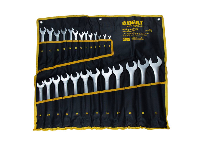 Ключі рожково-накидні 25 шт 6-32 мм CrV satine (чохол з тканини) Sigma (6010141). Характеристики: 25 шт: 6; 7; 8; 9; 10; 11; 12; 13; 14; 15; 16; 17; 18; 19; 20; 21; 22; 23; 24; 25; 26; 27; 28; 30; 32. Купити ключі рожково-накидні Sigma Ви можете, оформивши замовлення в нашому інтернет-магазині за допомогою простої форми, доставка здійснюється по всій Україні. Якщо у Вас виникли питання, Ви можете зателефонувати за вказаними номерами телефонів або замовити зворотний дзвінок. Фахівці нашого інтернет-магазину нададуть Вам докладні консультації та допоможуть зробити правильний вибір.