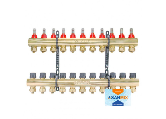 Колектор для теплої підлоги в зборі Wezer WF-11B 11 виходів з витратоміром і кріпленнями дозволяє сконцентрувати в одному місці всі теплові контури, що спрощує їх обслуговування і економить гроші. Його пластикові кріплення можуть змінювати довжину, спрощуючи процес монтажу. При цьому вони витримують високі температури і відрізняються значною міцністю.