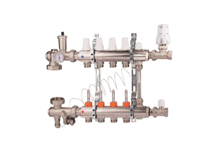 Колекторна група призначена для розподілення теплової енергії в системі тепла підлога. Дана установка застосовується в системах опалення підлоги, підключених до високотемпературного котла. Колекторна група дозволяє розподіляти первинний теплоносій при високій температурі на вторинному контурі з заданою температурою. Теплоносій надходить з первинного контуру, де температура вища, щоб забезпечити правильну роботу системи теплої підлоги.