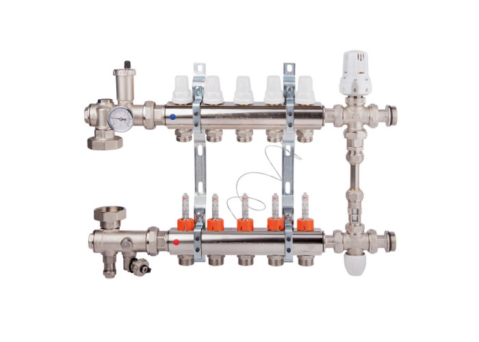 Колекторна група в зборі для системи «Тепла підлога». Без насоса. Кількість виходів 9. Різьба для підключення сервоприводів на термостатичних клапанах M28х1,5. Міжвісна відстань 50 мм. Різьба 3/4 євроконус. Колекторна група призначена для розподілу теплової енергії в системі тепла підлога. Дана установка застосовується в системах опалення підлоги, підключених до високотемпературного котла. Колекторна група дозволяє розподіляти первинний теплоносій при високій температурі у вторинному контурі із заданою температурою. Теплоносій надходить з первинного контуру, де температура вища, щоб забезпечити правильну роботу системи теплої підлоги.