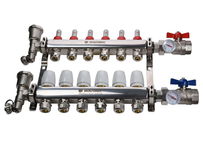 Матеріал колектора нержавіюча сталь, арматури і фітингів - латунь CW617N, ущільнювачами та золотникових прокладок - EPDM. У комплект входять кріплення.