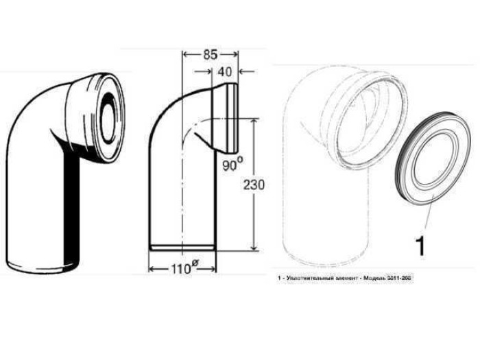Коліно Viega застосовується для зєднання унітазу, компакта з каналізаційною трубою, діаметром 110 мм, під кутом в 90 °. Комплектується спеціальним манжетом для ущільнення зєднання.