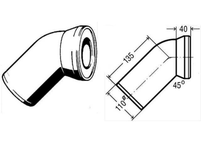 Коліно Viega застосовується для зєднання унітазу, компакта з каналізаційною трубою, діаметром 110 мм, під кутом в 45 °. Комплектується спеціальним манжетом для ущільнення зєднання.