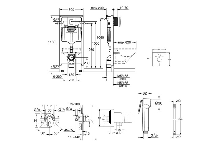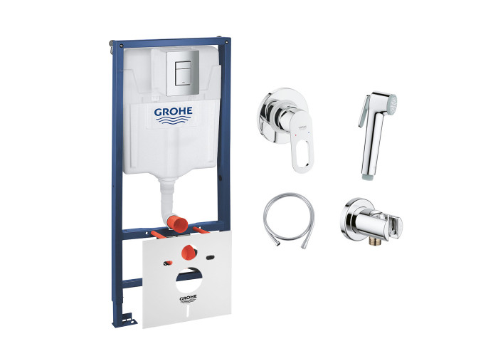 Інсталяція з панеллю змиву: Grohe Rapid SL 38772001. Гігієнічний душ зі змішувачем: Grohe BauLoop 111042.