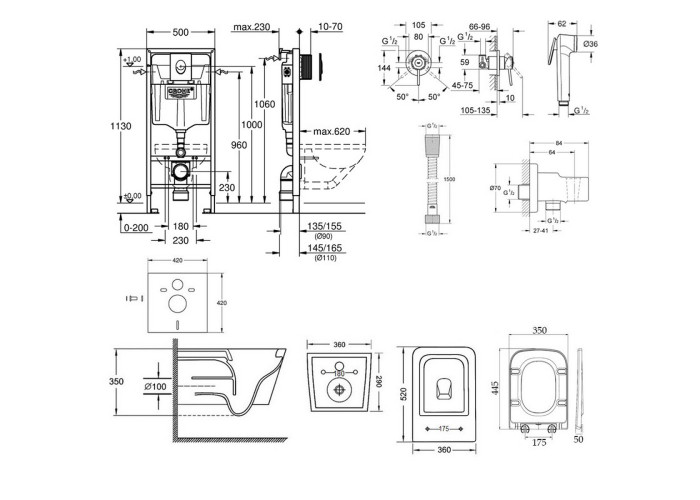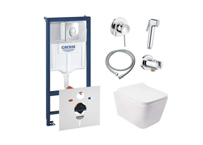 Унітаз, сидіння, інсталяція, панель змиву, звукоізоляційна прокладка, змішувач, лійка для гігієнічного душу, шлангове приєднання, душовий шланг, кріпильні деталі.