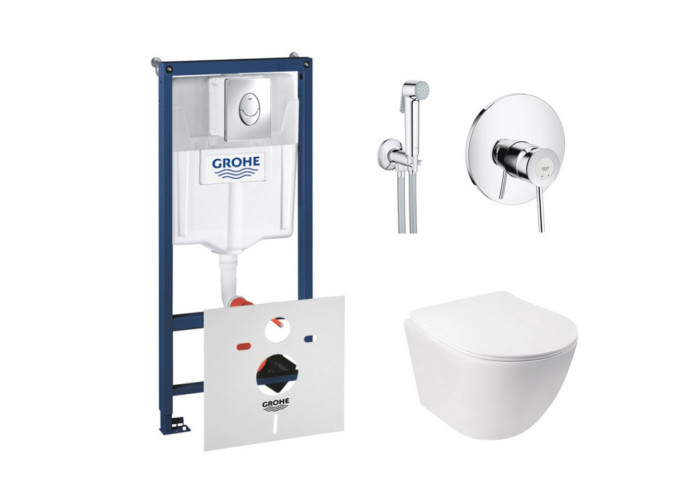 Унітаз, сидіння, інсталяція, панель змиву, звукоізоляційна прокладка, змішувач, лійка для гігієнічного душу, кронштейн, душовий шланг, кріпильні деталі.