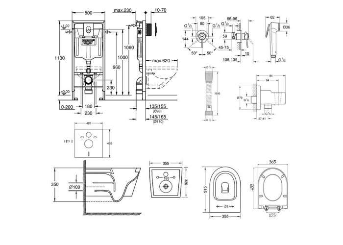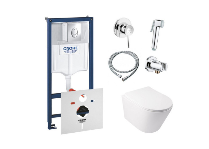 Унітаз, сидіння, інсталяція, панель змиву, звукоізоляційна прокладка, змішувач, лійка для гігієнічного душу, шлангове приєднання, душовий шланг, кріпильні деталі.