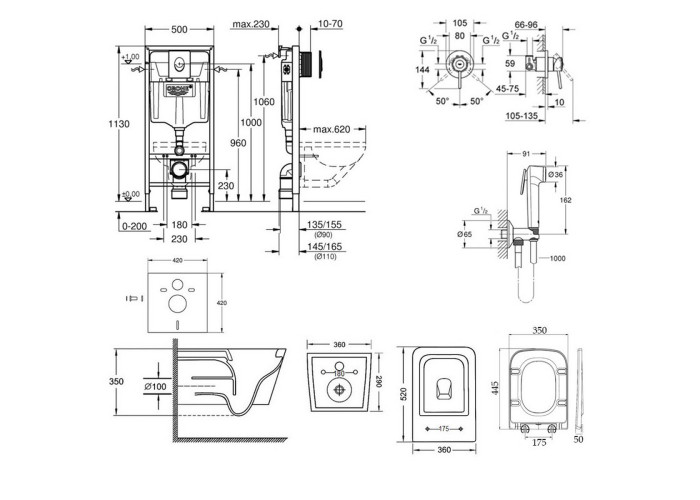 Унітаз, сидіння, інсталяція, панель змиву, звукоізоляційна прокладка, змішувач, лійка для гігієнічного душу, кронштейн, душовий шланг, кріпильні деталі.