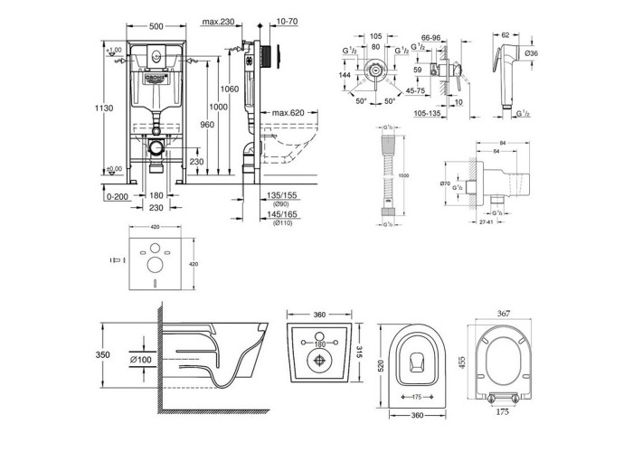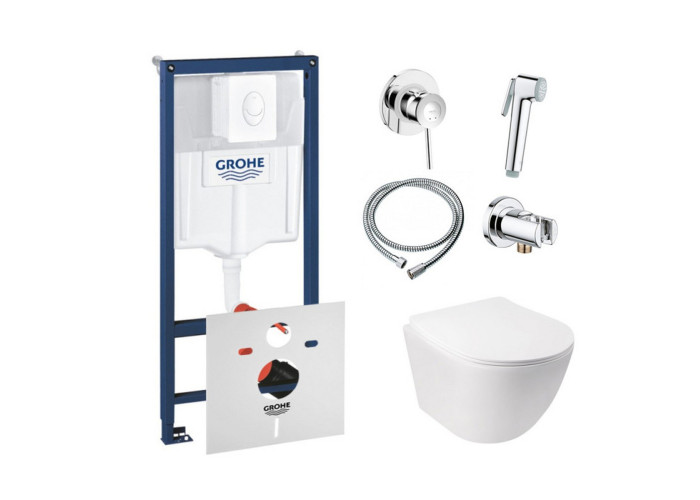 Унітаз, сидіння, інсталяція, панель змиву, звукоізоляційна прокладка, змішувач, лійка для гігієнічного душу, шлангове приєднання, душовий шланг, кріпильні деталі.