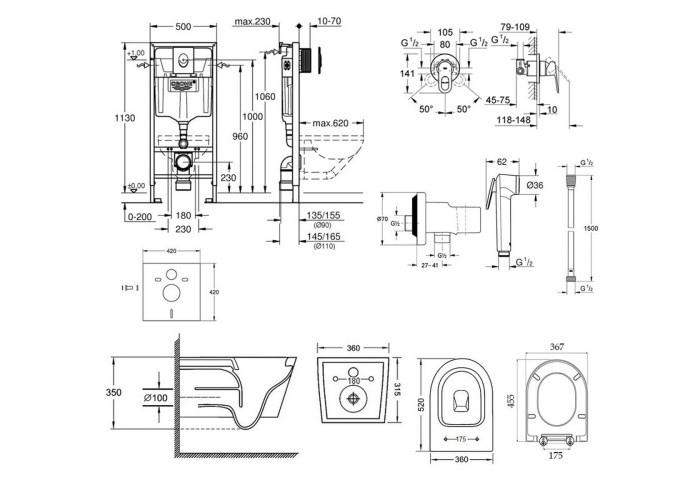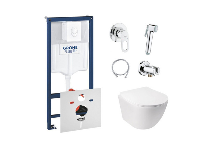 Унітаз, сидіння, інсталяція, панель змиву, звукоізоляційна прокладка, змішувач, лійка для гігієнічного душу, шлангове приєднання, душовий шланг, кріпильні деталі.