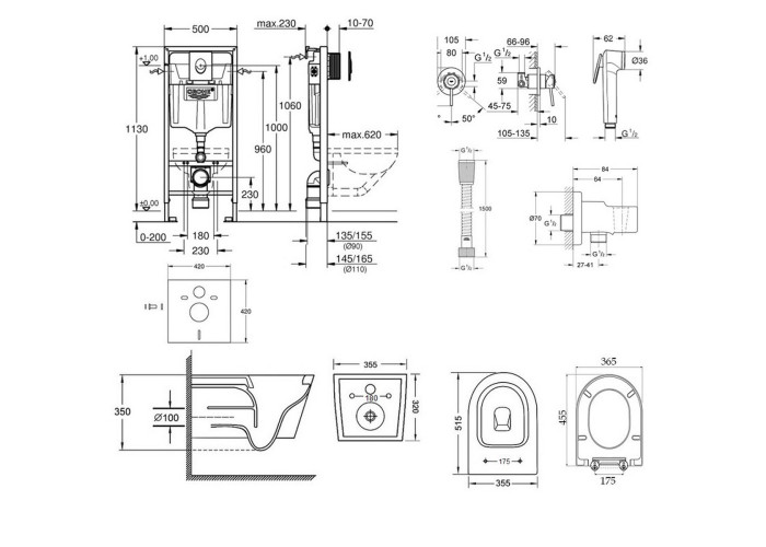 Унітаз, сидіння, інсталяція, панель змиву, звукоізоляційна прокладка, змішувач, лійка для гігієнічного душу, шлангове приєднання, душовий шланг, кріпильні деталі.