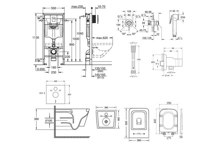 Унітаз, сидіння, інсталяція, панель змиву, звукоізоляційна прокладка, змішувач, лійка для гігієнічного душу, шлангове приєднання, душовий шланг, кріпильні деталі.