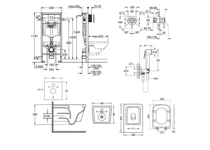 Габарити виробів (ВхШхД), мм Унітаз: 350х360х520. Сидіння: 50х350х445. Інсталяція: 1130х500х135. Панель змиву: 197х156х12