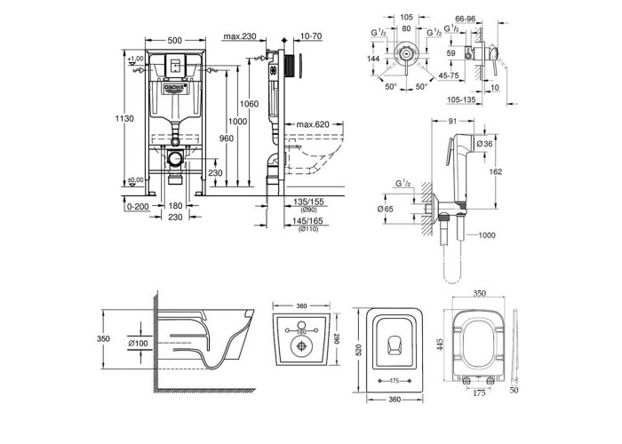 Габарити виробів (ВхШхД), мм Унітаз: 350х360х520. Сидіння: 50х350х445. Інсталяція: 1130х500х135. Панель змиву: 197х156х12
