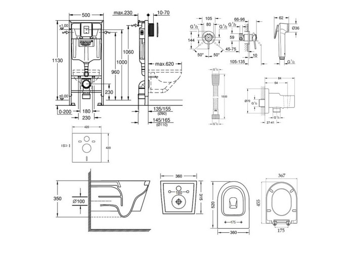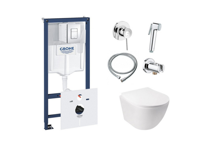 Унітаз, сидіння, інсталяція, панель змиву, звукоізоляційна прокладка, змішувач, лійка для гігієнічного душу, шлангове приєднання, душовий шланг, кріпильні деталі.
