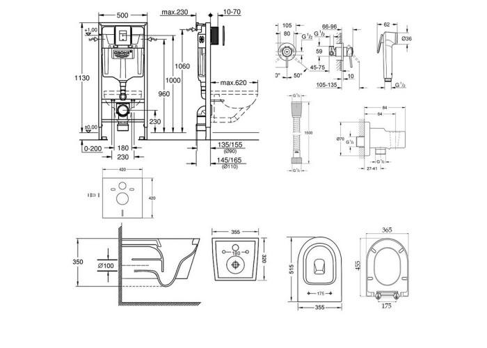 Габарити виробів (ВхШхД), мм Унітаз: 350х355х515. Сидіння: 35х365х455. Інсталяція: 1130х500х135. Панель змиву: 197х156х12