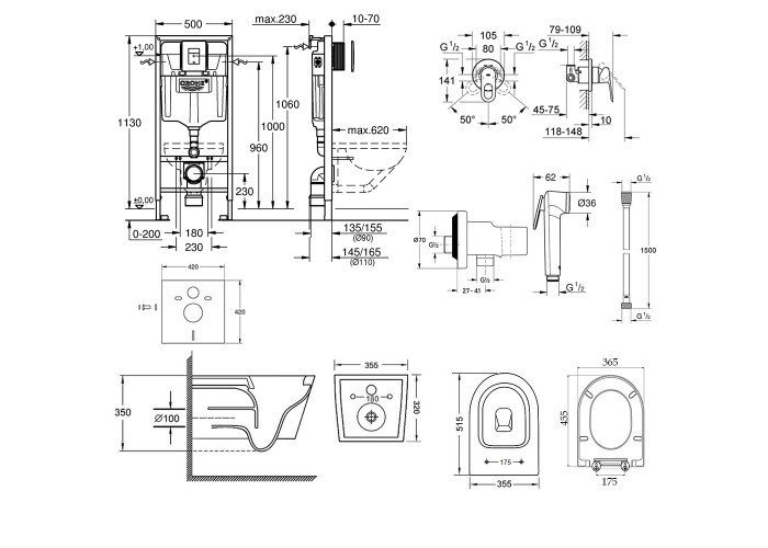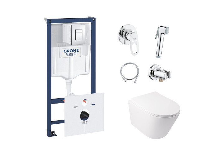 Унітаз, сидіння, інсталяція, панель змиву, звукоізоляційна прокладка, змішувач, лійка для гігієнічного душу, шлангове приєднання, душовий шланг, кріпильні деталі.