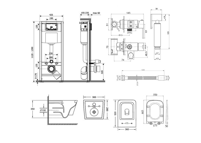 Габарити виробів (ВхШхД), мм Унітаз: 350х360х520. Сидіння: 50х350х445. Інсталяція: 1110х425х145. Панель змиву: 150х220х23